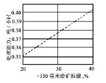 為使自磨機效率高工作,給礦中各粒級保持適當配比是重要的。某燒結總廠對給料中大小粒級配比的試驗結果列于表1。從表中可以看出,給料+300毫米粒級與-300毫米粒級各占50%時,其產量更高,磨碎效果更好。其產量與全部是粗粒級或全部是細粒級比較,分別提高30.6%和50.5%。又如北美的皮坎茲_瑪瑟公司(PickandsMather&Co)試驗了原礦中含不同比例)+150毫米粒級的物料對自磨的影響,如圖3-3-10所示。從圖中可看出,給礦中+150毫米粒級的物料產率減少,自磨機的處理能力也隨之降低。為此,認為首段自磨機的給礦粒度組成應保持在+150毫米占40%,-150+75毫米占20%和-75毫米占40%。因而,必須采取配礦措施以保持給入自磨機的原礦粒度特性合適。