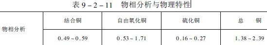 該礦屬于石英閃長斑巖與石灰系灰?guī)r接觸交代矽卡巖銅礦床。礦石呈土狀,氧化程度較深。由于成巖階段次生富集作用,銅液擴散推移過程中與硅、鐵和鋁的鹽類及其氧化物形成結(jié)合性氧化銅,覆蓋于表面及間夾于孔雀石類型礦石中。含銅礦物以孔雀石為主,有少量藍銅礦、硅孔雀石和水膽礬等。鐵的礦石主要為褐鐵礦,磁鐵礦和亦鐵礦次之。脈石除鐵質(zhì)粘土外,還有石英、云母、石榴子石、角閃石、蛇紋石、綠泥石和方解石等。原礦中鐵質(zhì)粘土含量很高,-200目高達48%,礦石含水27.1%,較大塊的礦石300毫米左右。原礦物質(zhì)組成列于表9-2-10和表9-2-11。