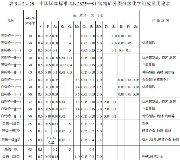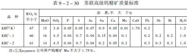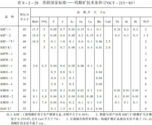 表9-2-29及表9-2-30為蘇聯(lián)國(guó)家鎢精礦產(chǎn)品標(biāo)準(zhǔn),表9-1-31為國(guó)外質(zhì)優(yōu)鎢精礦產(chǎn)品標(biāo)準(zhǔn)。